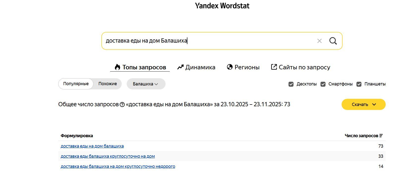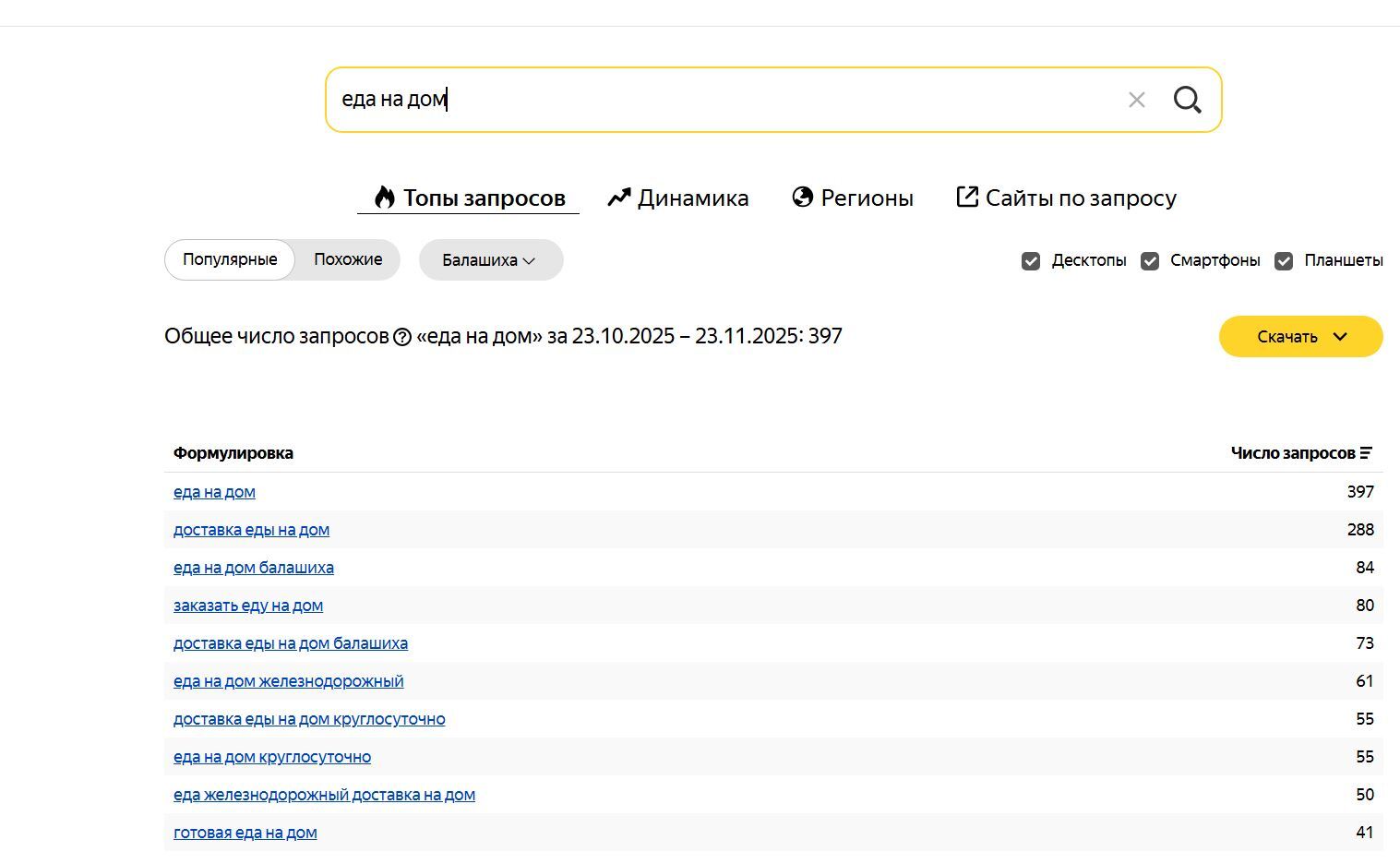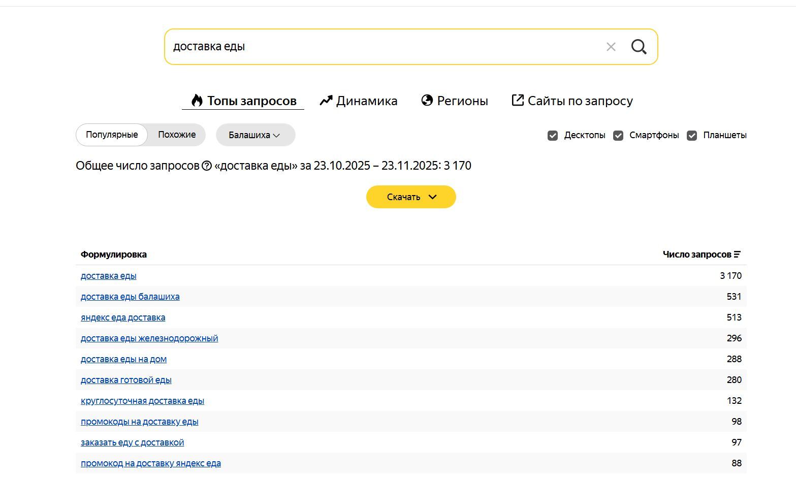 "Доставка еды" — 3170 показов "Доставка еды на дом Балашиха" — 73 показа