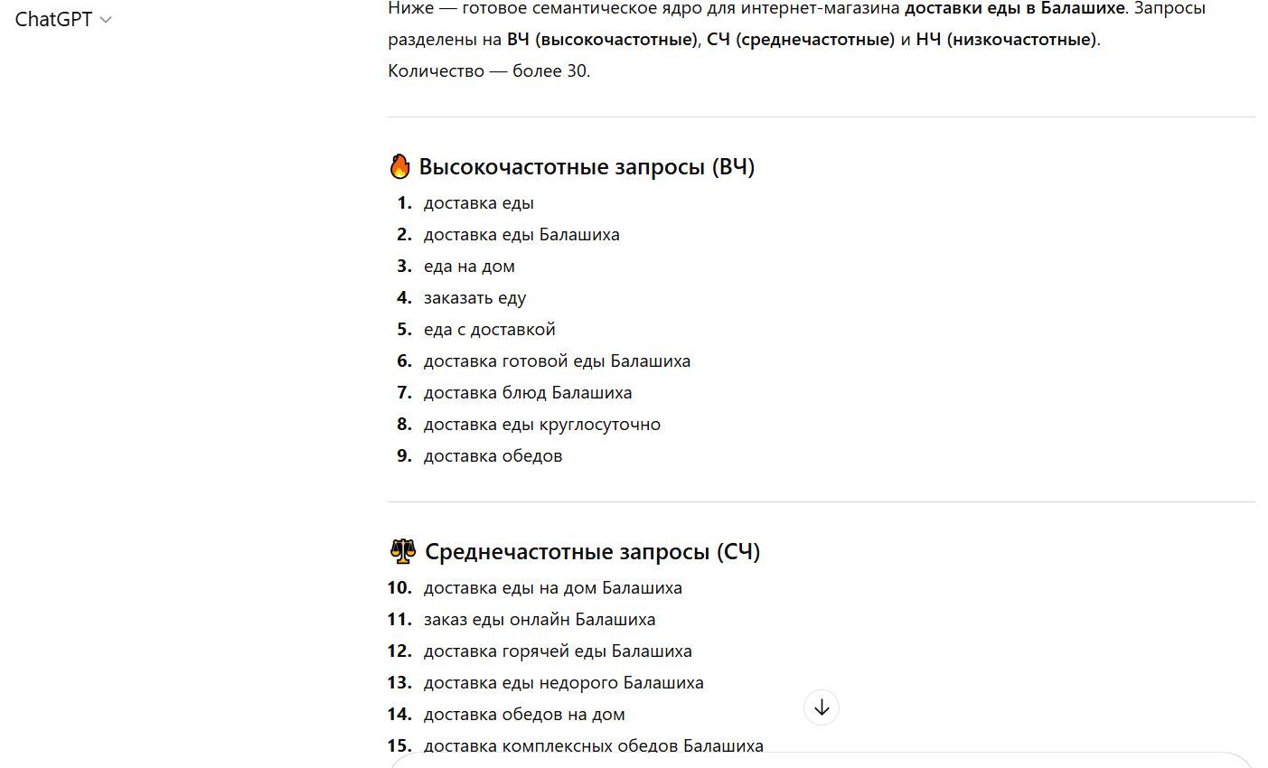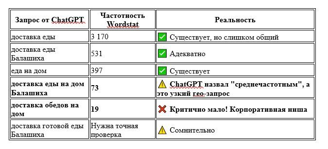 Решили проверить. Взяли реальную задачу — доставка еды в Балашихе, дал ChatGPT максимально конкретное ТЗ и получили список из 30+ запросов. Выглядело убедительно